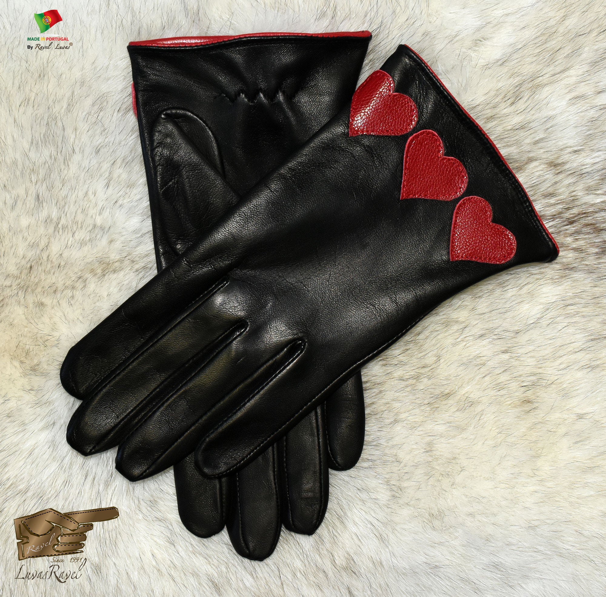 Ladies Leather Gloves with Red Hearts and Elastic on the bottom of the gloves