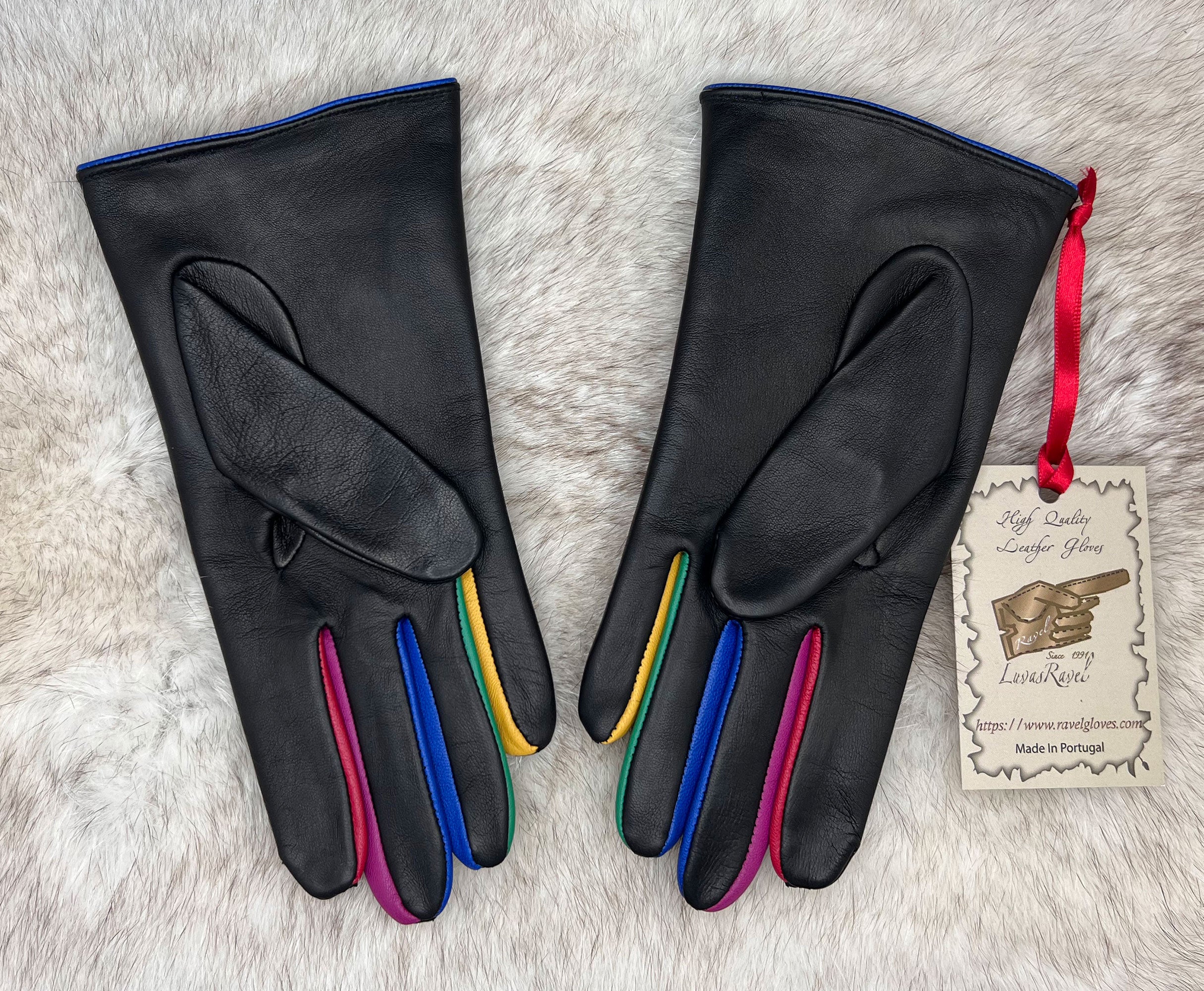 Crafted from premium leather, these gloves boast a rich and supple texture, providing both comfort and durability. The incorporation of six distinctive colors—Black, Blue, Green, Pink, Yellow, and Red—creates a mesmerizing kaleidoscope of hues. The Black base serves as an elegant canvas, while the dynamic interplay of Blue, Green, Pink, Yellow, and Red adds an exhilarating burst of energy and style.